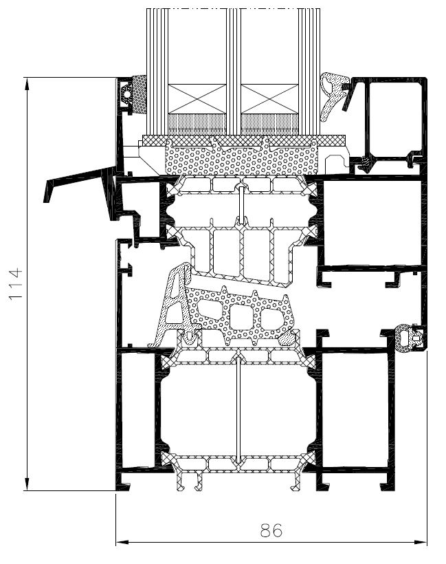 - stavební hloubka rámu 77 mm, dveřní křídla 77 mm a okenní křídla 86 mm